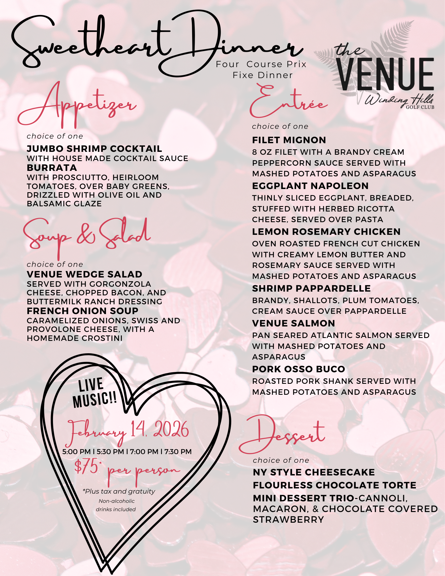 Email TheVenue@windinghillsgc.com to reserve your table. Prepaid tickets and reservations are required.