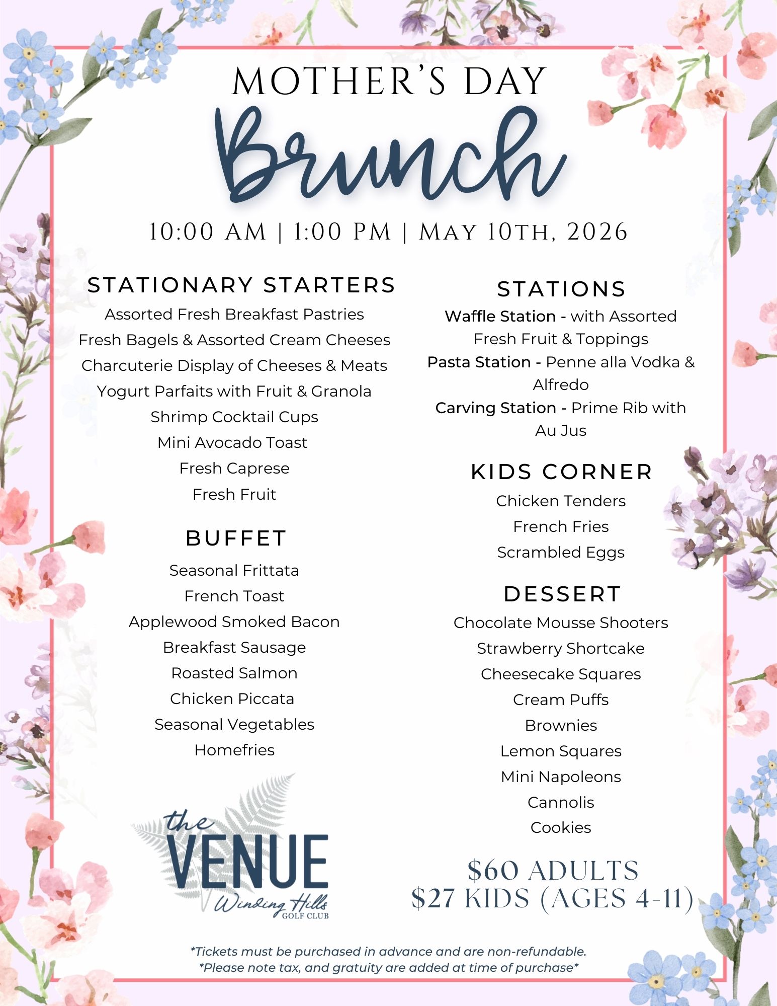 Pre-paid tickets are required. To reserve your seating, please email thevenue@windinghillsgc.com with your name, number of adults & number of children, phone number, and time requested. An invoice will be sent, and payment is due within 24 hours to secure your seat.