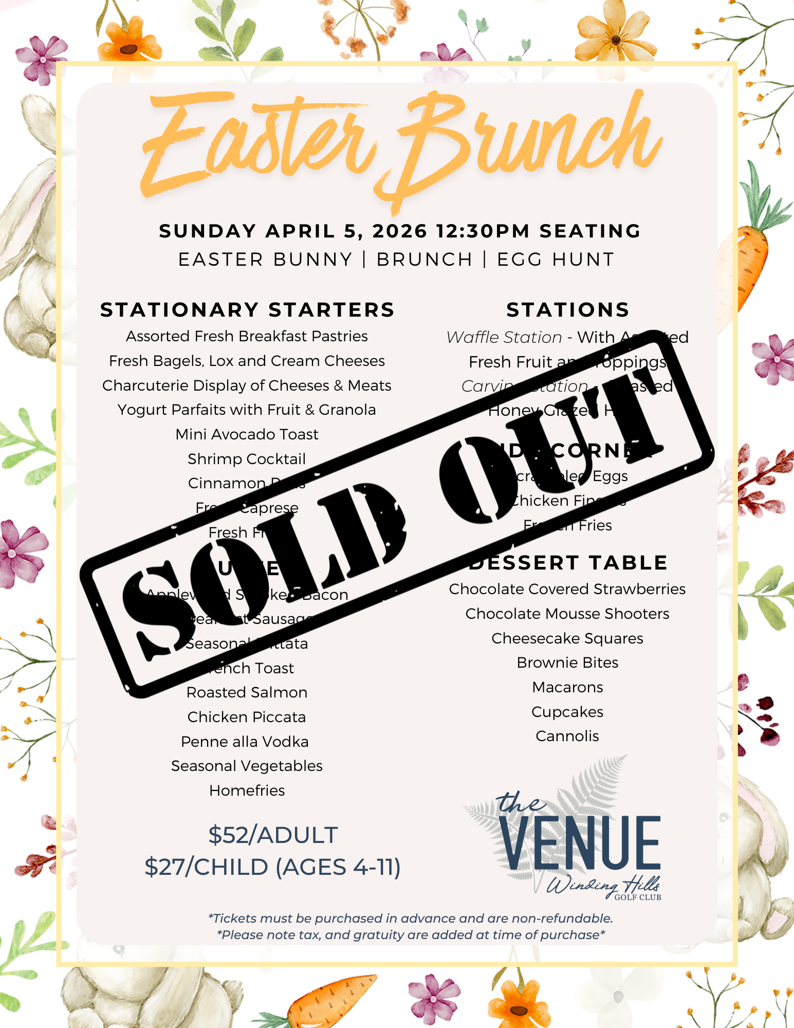 Pre-paid tickets are required. To reserve your table please email thevenue@windinghillsgc.com with your name, number of adults & number of children, and phone number. An invoice will be sent and needs to be paid within 24 hours to secure your seat.